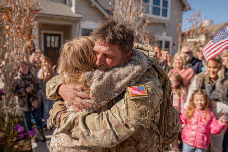 Military personnel warmly embraces young girl in a touching reunion, surrounded by family and friends, showcasing love, joy, and emotional connection in a vibrant setting