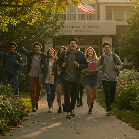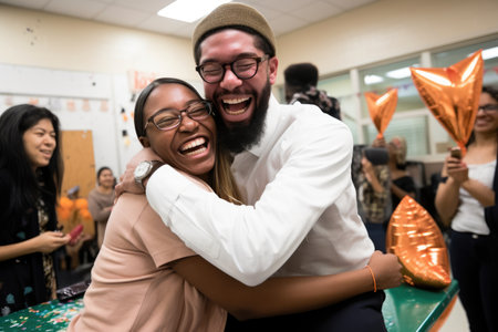 High school students gleefully tossing vibrant confetti in the air, marking their graduation with laughter and jubilation