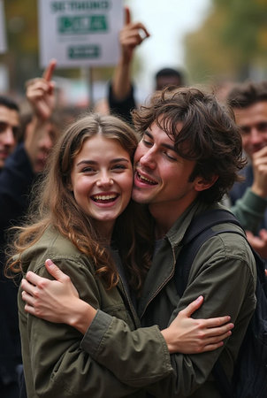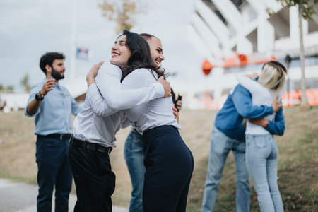 Generative AI : Multi ethnic young people team hugging together outside International community of students support and help each other Friendship team building and diversity con