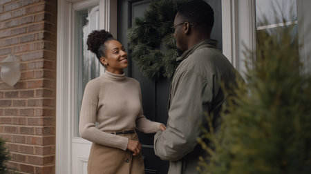 A cheerful homeowner warmly welcomes her guest at the door, creating a friendly atmosphere.