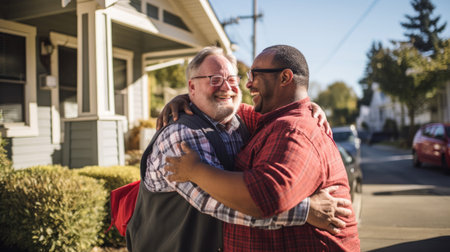 Happy men in casual embracing each other. Close friends meeting on outdoor building terrace, hugging and greeting each other. Affection concept