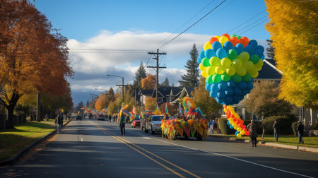 A kaleidoscope of color explodes as the Pride parade erupts in joy. Dazzling floats, a sea of vibrant costumes, and a jubilant crowd celebrate love and acceptance in an unforgettable scene. AI-generated