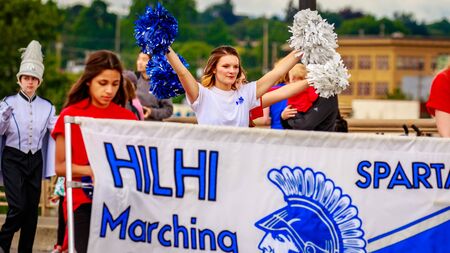 Portland, Oregon, USA - June 11, 2016: Hillsboro High School Marching Band in the Grand Floral Parade during Portland Rose Festival 2016.