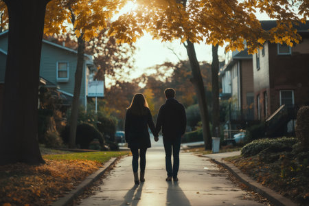 Romantic couple holding hands walking down a tree lined street in a quiet residential neighborhood during a beautiful fall sunset