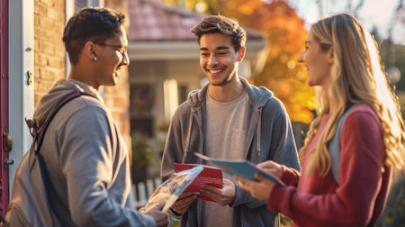 Election volunteers engaging with voter at their front door promoting their candidate's platform. Natural light. Political campaign, elections and democracy concept. Design for poster, banner, flyer.