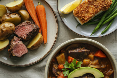 Assorted traditional European meals with soups, salads, and main courses on wooden trays