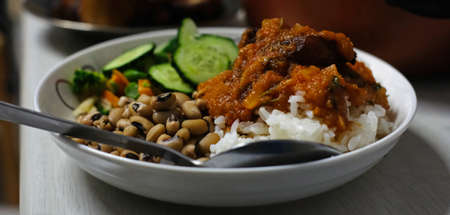 A Plate of Rice and Beans with Vegetables, Stew and Chicken