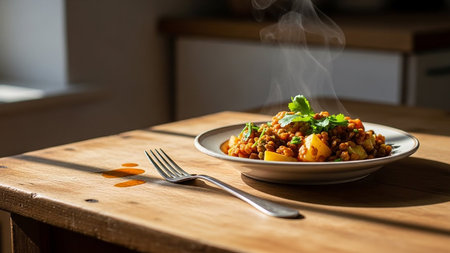 A steaming bowl of lentil and potato stew sits on a rustic wooden table, illuminated by sunlight, with a fork nearby.
