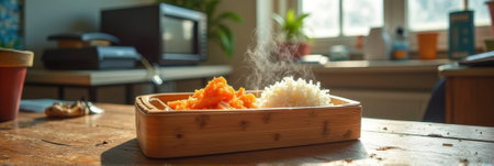 Steaming rice with carrot sticks on wooden table in sunlit kitchen. That the image is generated using AI.