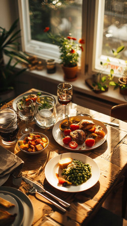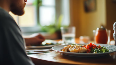 A person enjoys a half eaten meal on a table, featuring a colorful plate of chicken, vegetables, and tomatoes. The cozy setting and natural light create an inviting atmosphere.