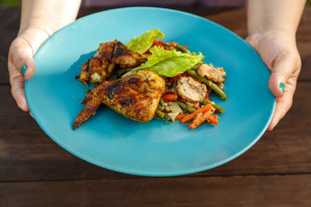 Female hands put a blue plate with chicken and vegetables on a wooden table. horizontal photo