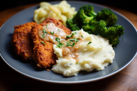 Spicy chilli chicken fillets served with mashed potatoes and salad of tomatoes, cucumbers and onions, tasty food