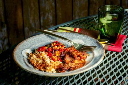Mexican grilled steak carne asada served with brown rice and beans with corn