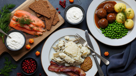 A traditional Nordic holiday feast featuring a variety of dishes including Swedish meatballs with peas and potatoes smoked salmon on dark bread and lutefisk with bacon. The spread represents a classic Scandinavian Christmas or festive dinner.