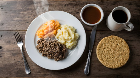 A traditional Scottish Burns Night supper features haggis served with neeps and tatties on a white plate. The meal is accompanied by an oatcake and a small bowl of rich gravy, presented on a rustic wooden table.