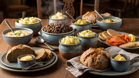A rustic wooden table is spread with a hearty feast featuring bowls of creamy soup, mounds of mashed potatoes, minced meat, and slices of brown soda bread. The arrangement suggests a traditional, comforting family dinner, possibly of Scottish or Irish origin.