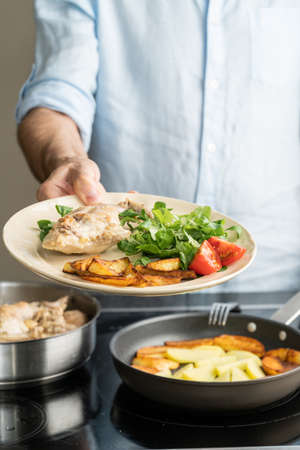 The hands of a man cook potatoes in a frying pan. Family dinner