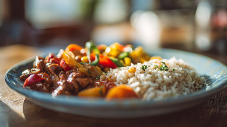 Homemade mushroom stir fry with rice on a wooden table in cozy kitchen. That the image is generated using AI.