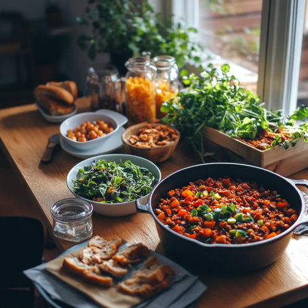 Hearty vegan feast with stews and fresh salads on wooden table near sunlit window.