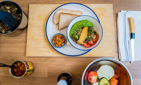 Healthy quinoa bowl with avocado, mushrooms and fresh vegetables