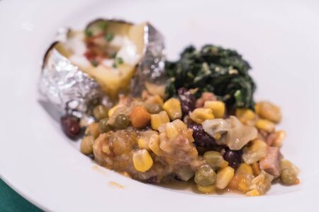 Baked kumpir potato stuffed with the cheese, sausage, olives, peppers and corn