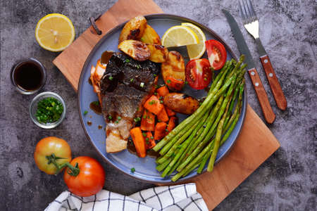 Homemade Grilled Salmon Steak with Broccoli, Potatoes, Carrots .In a plate on a wooden table