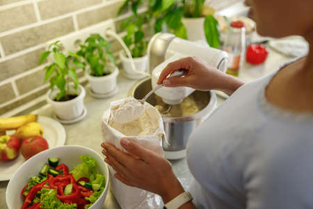 Beautiful smily handsome woman is preparing tasty fresh raw italian pasta at her kitchen at home