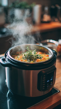 A pressure cooker is filled with vibrant soup and garnished with fresh herbs, emitting steam on a wooden kitchen countertop, highlighting the joy of cooking and flavorful meals