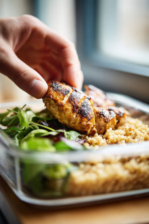 A close up view of a hand delicately placing grilled chicken onto a bed of fluffy quinoa and vibrant greens in a glass dish, emphasizing healthy eating and meal preparation