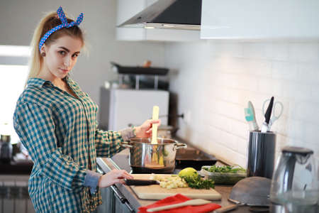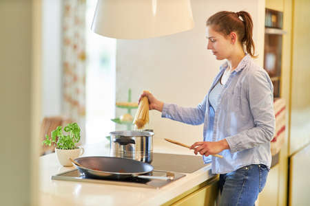 Young woman at the stove in the kitchen makes spaghetti as a housewife and hobby cook