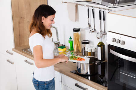 Young Happy Woman Putting Chopped Vegetables In Utensil At Kitchen