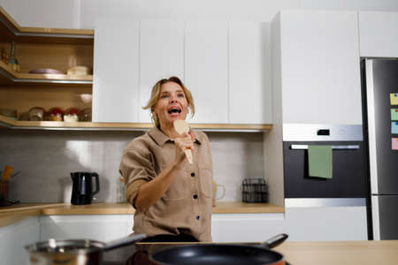 Mature woman cooks food in the kitchen and sings using a wooden spatula as a microphone