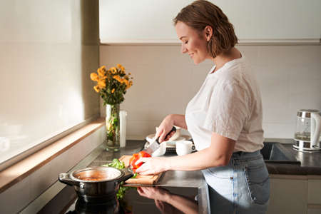 Happy young woman is preparing the diner in the kitchen. Healthy female lifestyle. Diet
