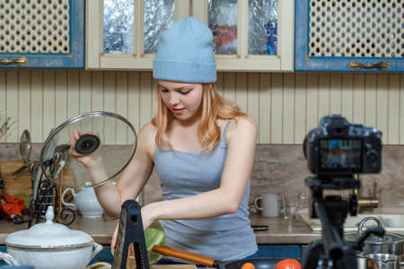 cute teenage girl is filming a cooking show
