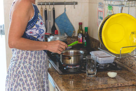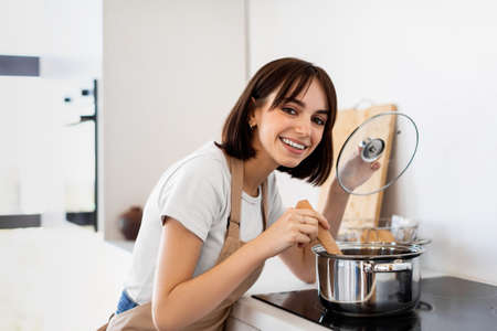 young woman cooking food in a pot in the kitchen.