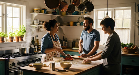 A joyful family of three, including parents and a teenage son, prepares a meal together in a rustic kitchen. They are cutting vegetables and kneading dough, enjoying quality time and laughter while cooking.
