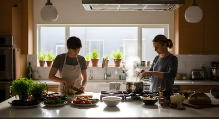 Two women prepare a meal together in a bright, modern kitchen. One woman chops herbs on a cutting board while the other stirs a pot on the stove, surrounded by fresh ingredients.