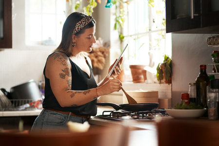 Woman, reading or tablet in kitchen for cooking, recipe tutorial or streaming lesson online. Girl, meal prep or tech in home for food blog website, nutritional guide app or lunch idea on social media