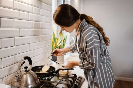 Focused beautiful woman making pancakes at home kitchen