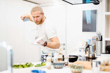 Young white man making fun while cooking in kitchen at home