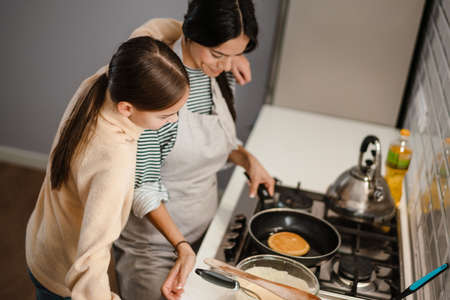 Happy beautiful mother and daughter smiling while cooking pancakes in cozy kitchen