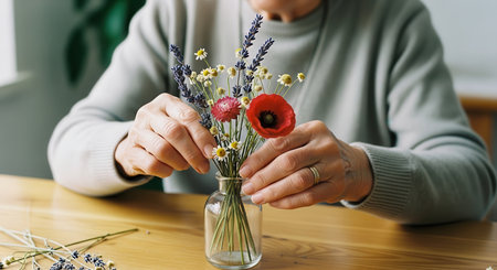 Senior woman hands gently place dried lavender, chamomile, and poppy flowers into a clear glass vase on a wooden table. highlights a peaceful hobby and creative activity.
