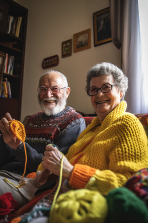 Senior couple knitting together in their living room.