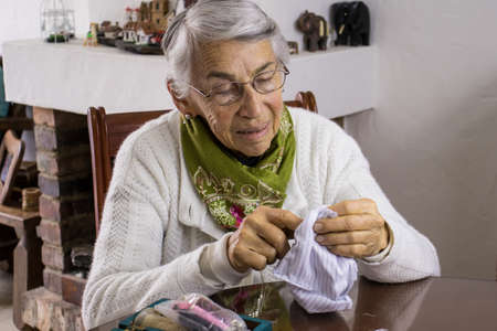 an elderly woman sews torn clothes. close-up of women's hands with thread and needle. the concept of poverty.