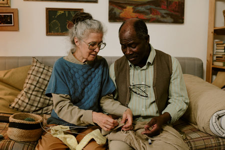 Senior Caucasian woman and senior Black man sitting together on couch knitting and sewing, focusing on handmade crafts, showing teamwork and companionship in modest home setting