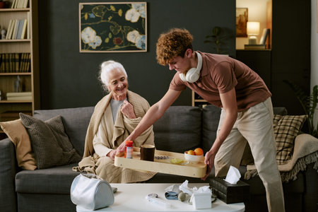 Senior Caucasian woman sitting on sofa smiling at young Caucasian man serving breakfast on tray, young man wearing headphones, living room setting with visible medical supplies