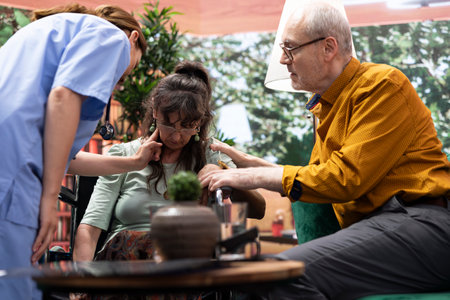 Senior Caucasian woman sitting on sofa receiving blood pressure check from young adult Caucasian female nurse, while senior Caucasian man with disability in wheelchair observing in nursing home