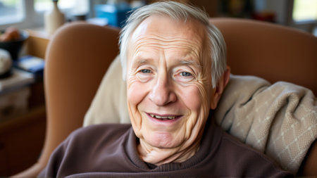 Portrait of an elderly man with kind eyes. A man is sitting in a chair at home