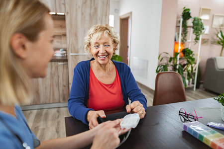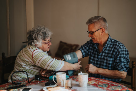 Elderly woman measures her companions blood pressure at home, a caring family moment