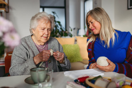 Elderly grandmother and adult granddaughter at home, knitting.